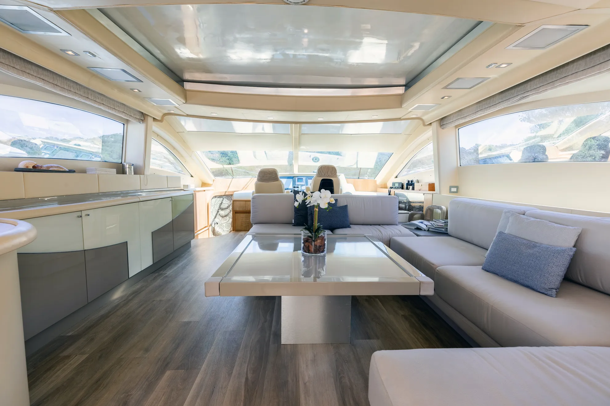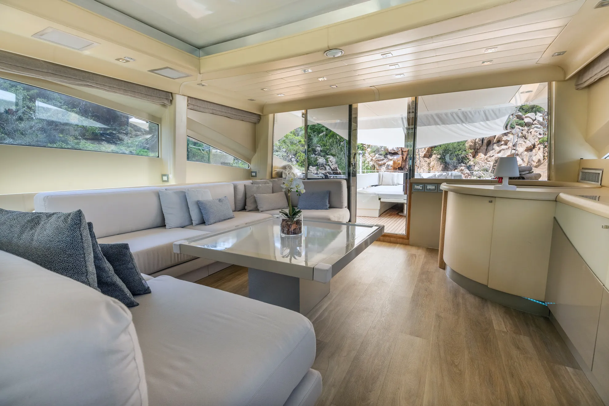The Jaguar 76 Charter Porto Cervo accommodates up to eight sleeping guests across four cabins. The layout maximizes comfort while maintaining efficient use of space. Large windows in the salon allow natural light to enter, creating a bright and welcoming atmosphere.