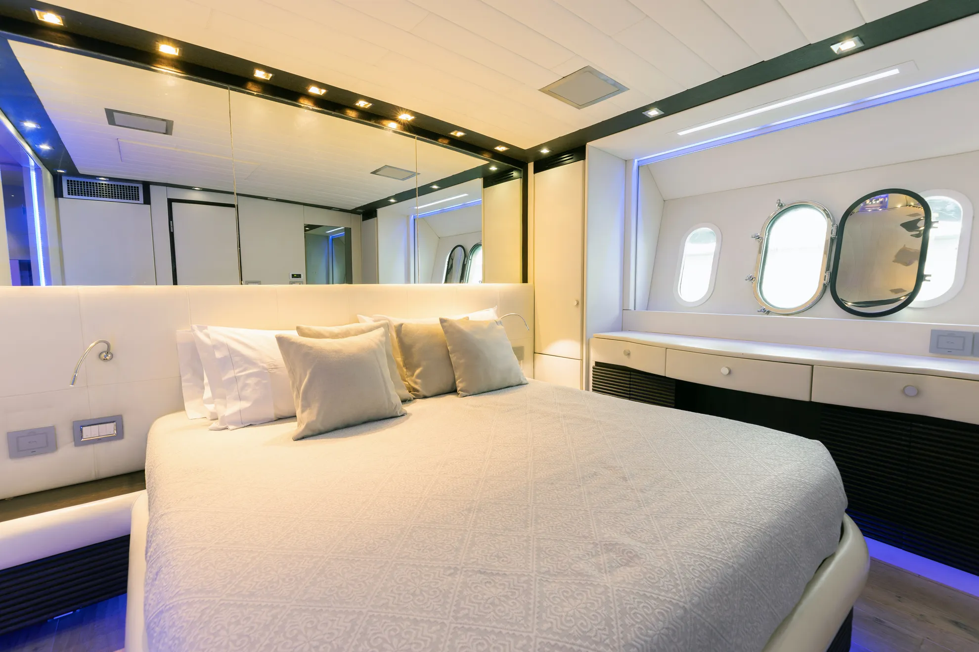 The yacht cruises comfortably at 25 knots with a maximum speed of 38 knots.